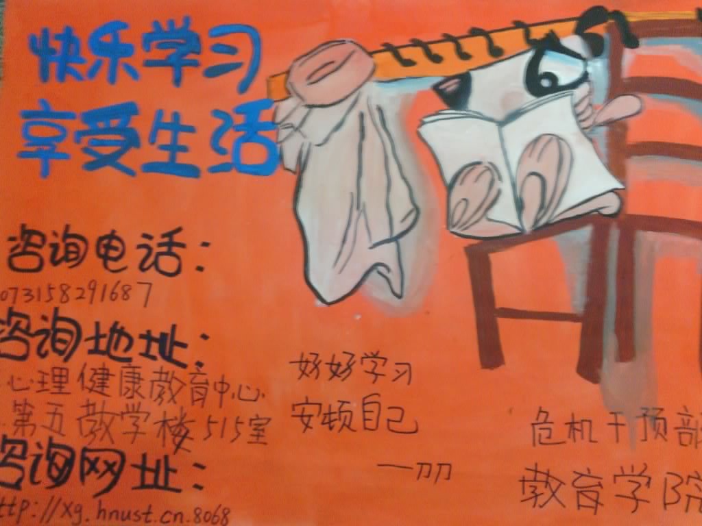 快乐学习,享受生活。为了提醒大学生在享受生活的同时不要忘记学习的重任,必赢76net线路官网危机干预部组织了关于“快乐学习,享受生活”的海报宣传活动,倡导同学们先学习后享受。