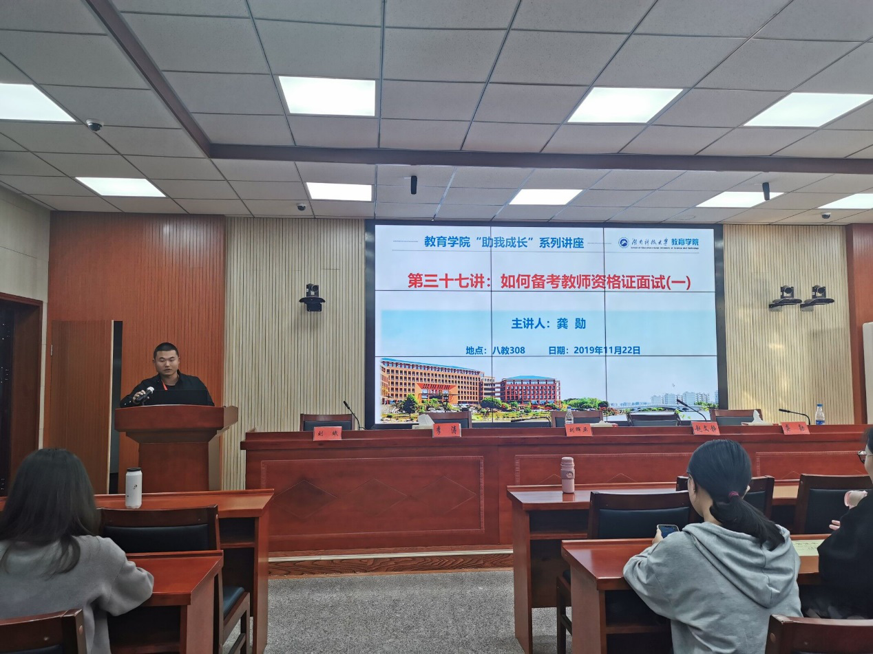 表彰大会结束后,“助我成长”系列讲座第三十七讲——如何备考教师资格证面试(一)顺利举行,龚勋作为主讲人来帮助同学们答疑解惑,更好地解决面试中的问题。他衷心希望每一个对教育事业感兴趣、有激情的人,都能如愿以偿成为一名光荣的人民教师。