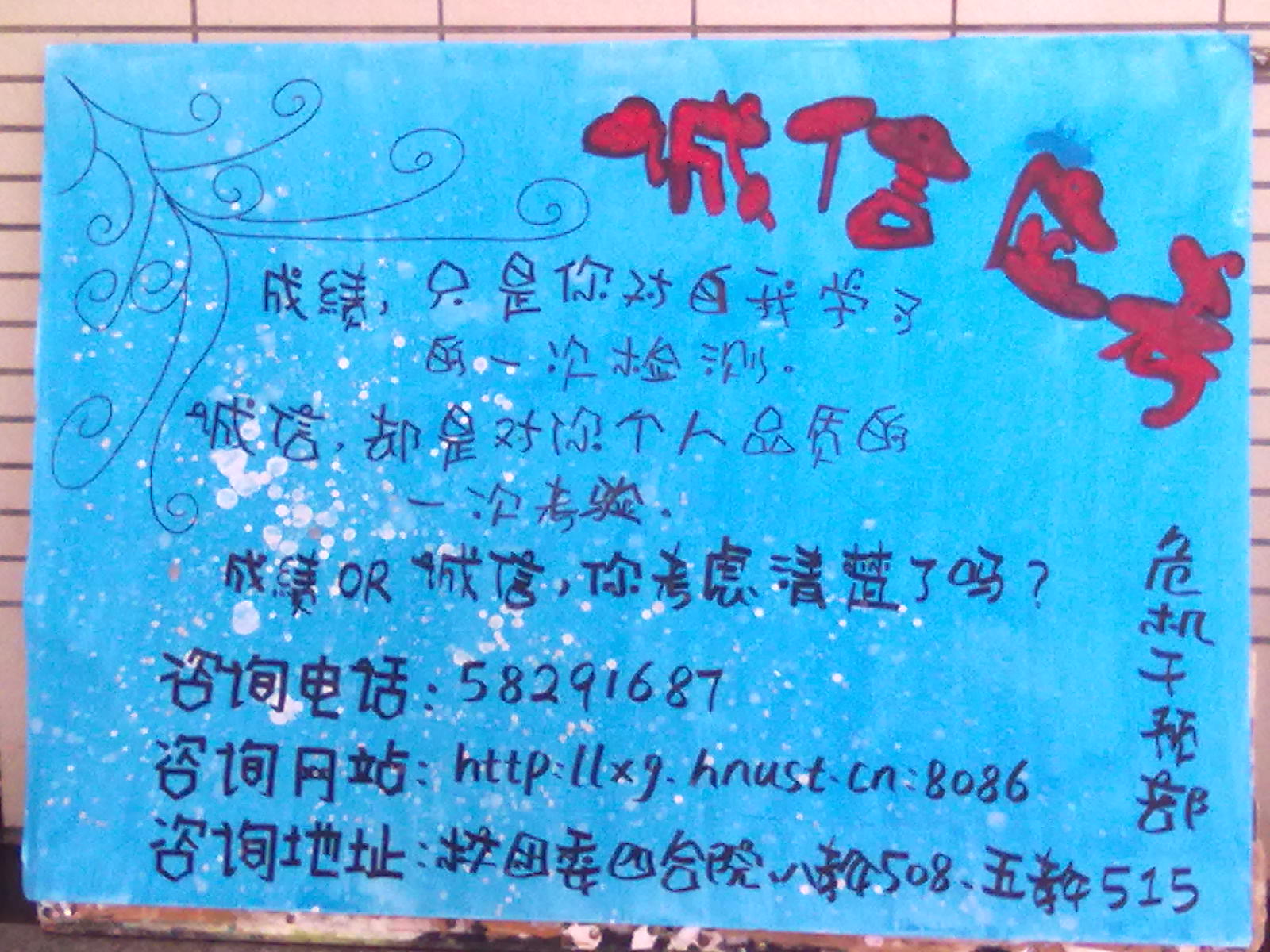 6月份是考试月,诚信应考是我们每个人都必须遵守的,为了让每位同学积极参与这次活动,以身作则,必赢76net线路官网团委学生会危机干预部,为此特别制作海报向大家宣传,希望每个教育学子在考试中,做好成绩与诚信的评估,用实力取得成绩,而不是为了成绩失去诚信。