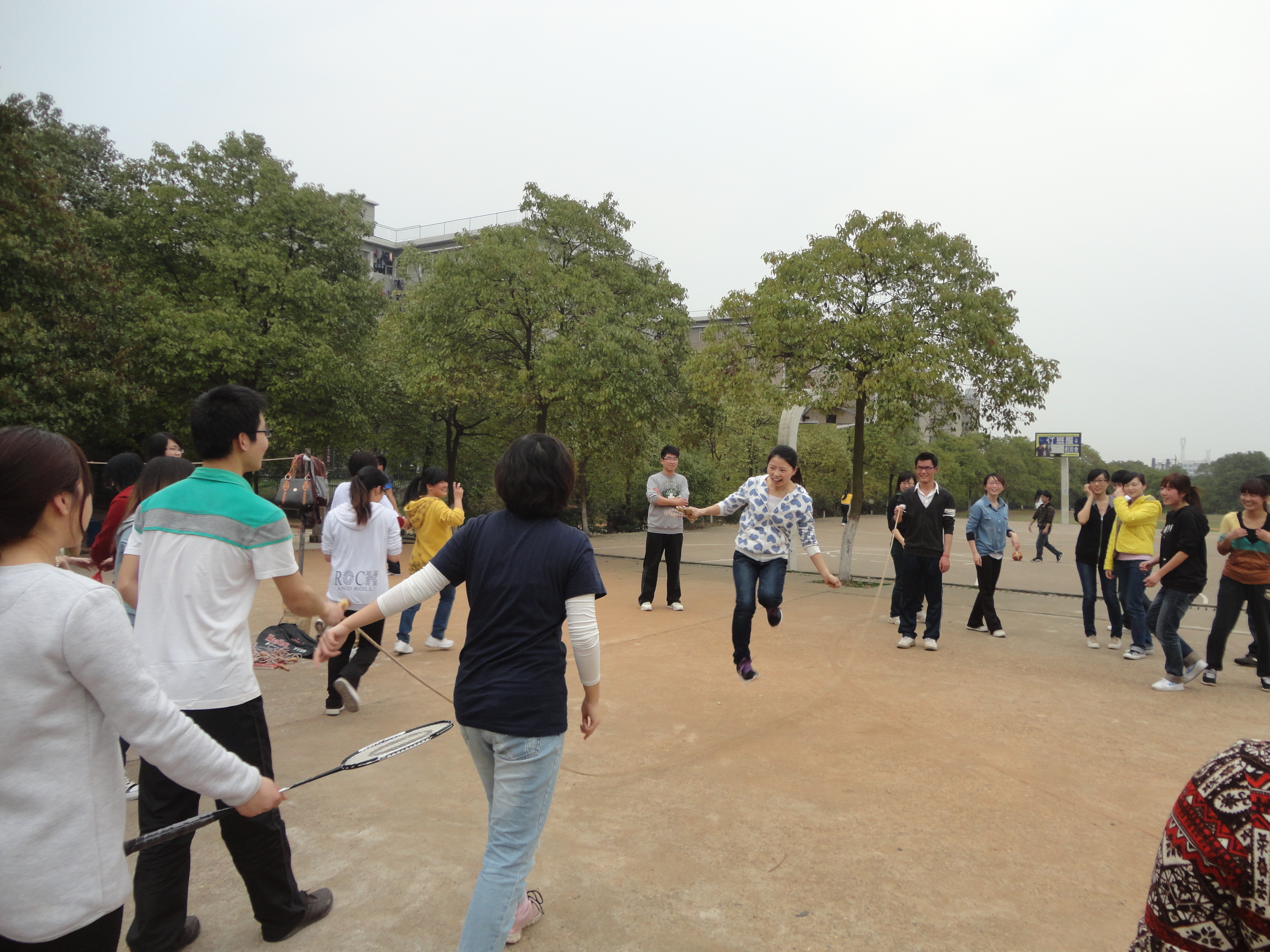 与羽毛球同时举行的是跳绳比赛。一根普通的绳子在同学们的手里产生了奇特的效应:麻花跳、反身跳、双人跳、单腿跳……花样百出,令观者眼花缭乱,应接不暇。虽然,跳绳是女生的长项,但在比赛中依旧不乏男生的身影,其中尤以“两佳宝”惹人注目:一班的重量级人物,七猛男之首的贾佳同学,虽是满头大汗,但却乐在其中;二班的巨无霸,体重近八十公斤的李佳同学跳的也是有模有样,不亦乐乎。