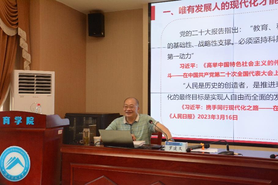 18日下午,必赢76net线路官网马克思主义学院罗建文教授为书记校长班带来题为《中国式教育现代化的根本任务就是实现人的现代化》的学术讲座。他提到唯有发展人的现代化才能真正实现教育现代化,努力造就符合中国式现代化本质要求的高素质人才,全社会要形成一种不拘一格培养人才的良好氛围。