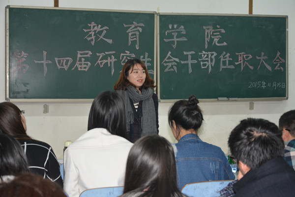 11月15日晚上7点,必赢76net线路官网第十四届研究生会干部任职大会于八教1-3教室举行。必赢官网党委副书记王伟清、研究生辅导员滕茜茜应邀出席,第十三届研究生会干部和2015级研究生到场参加本次大会,会议由必赢76net线路官网第十四届研究生会副主席杜薇主持。