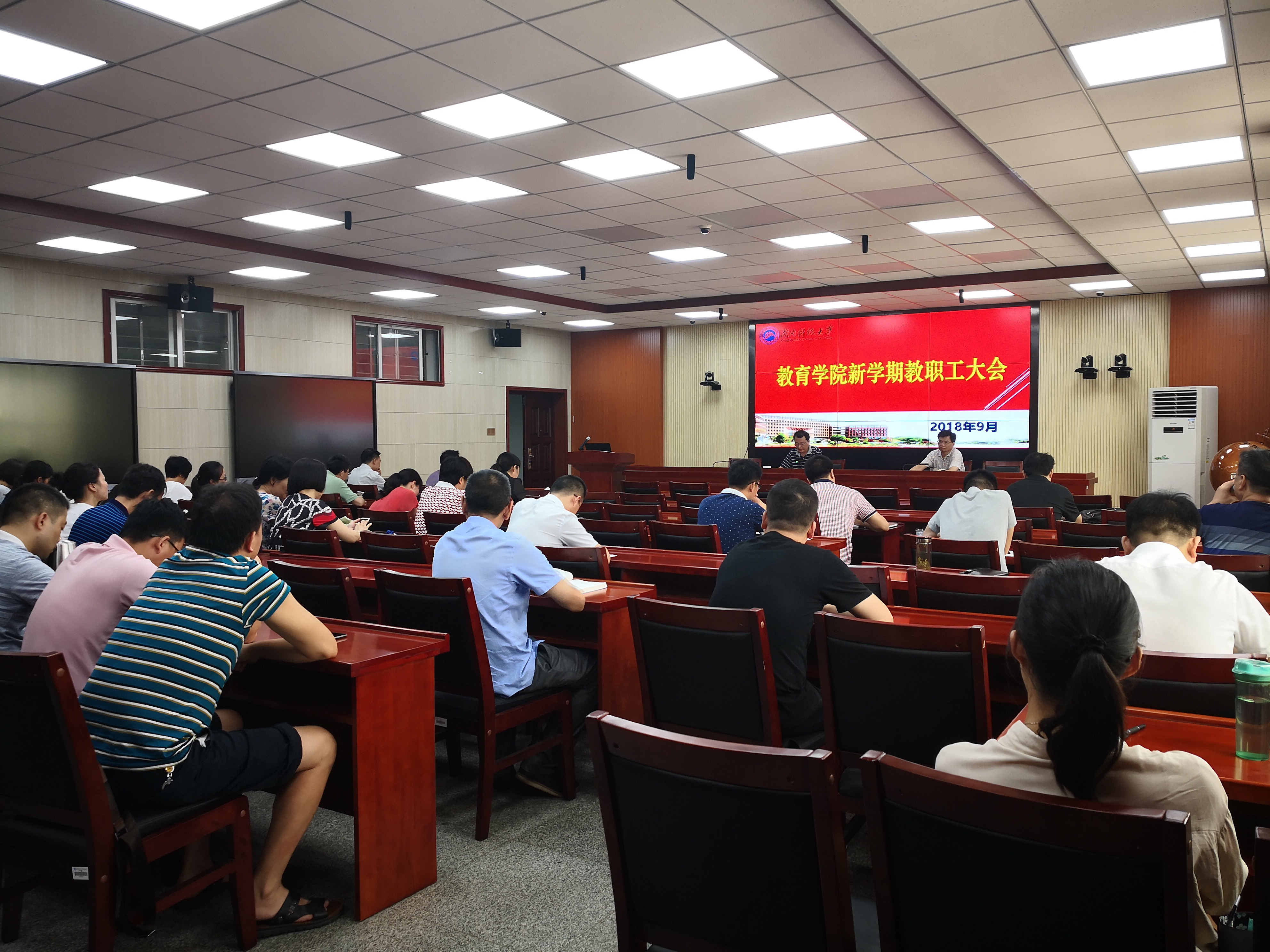 院长李海萍首先对学院2018年上半年的工作进行了梳理与回顾。他指出,在学校党委行政的正确领导、各职能部门的具体指导和全院师生的共同努力下,学院聚焦本科教学审核评估整改和校“双一流”建设,各项工作稳步推进、成效显著。围绕2018年下半年工作,他强调:一要继续做好审核评估专家意见整改落实工作,调整优化本科专业结构,准备适时启动师范专业认证;二要进一步优化研究生管理运行机制,努力提高研究生培养质量,注重内涵建设;三要着力加强学科建设,强化规划意识和成果导向,不断提升核心竞争力;四要全院上下联动,以教风促学风,构建全员全过程全方位育人体系,助推学生成长成才成功;五是持续改进学习,抓好日常管理,提升服务水平。