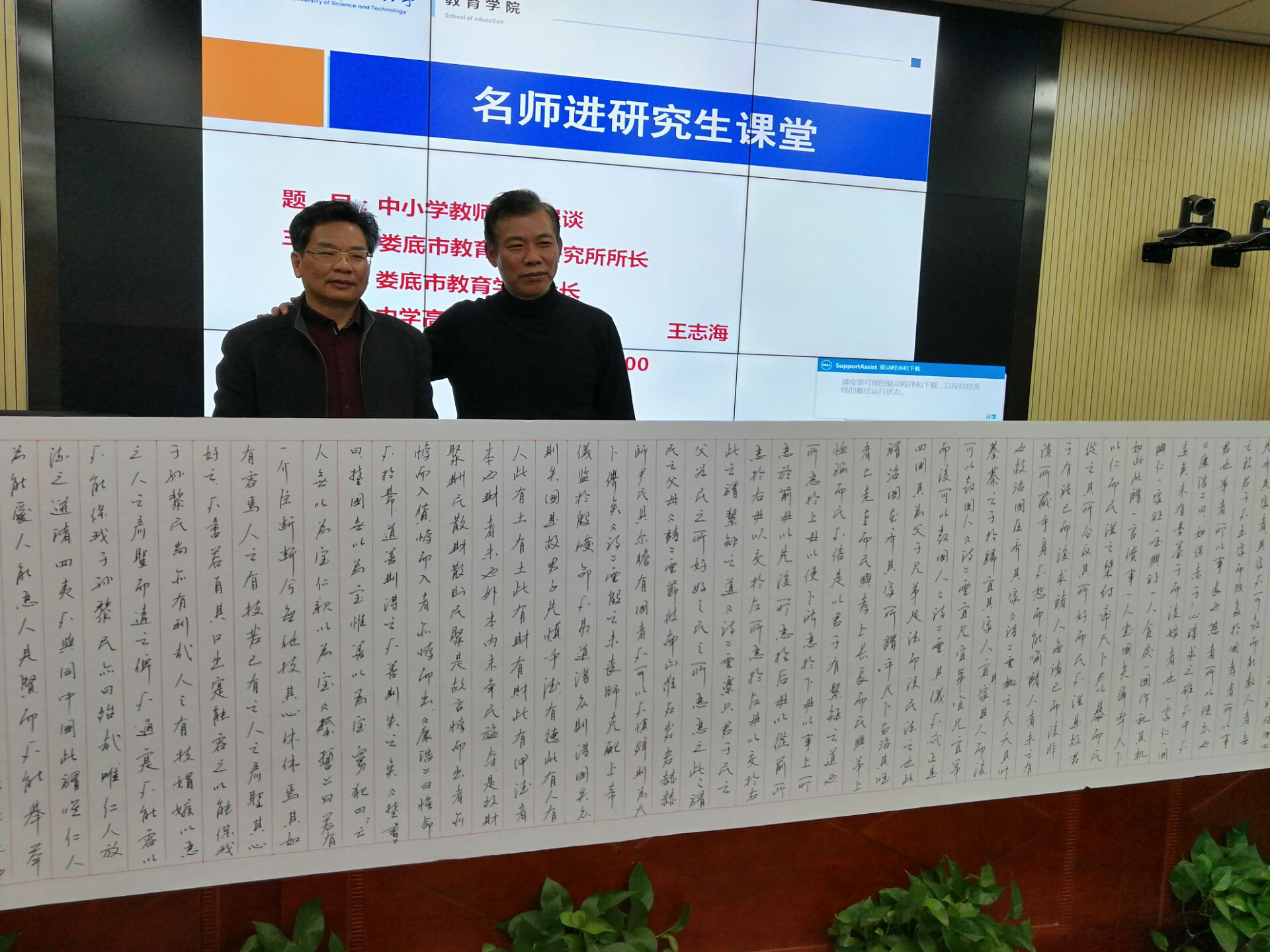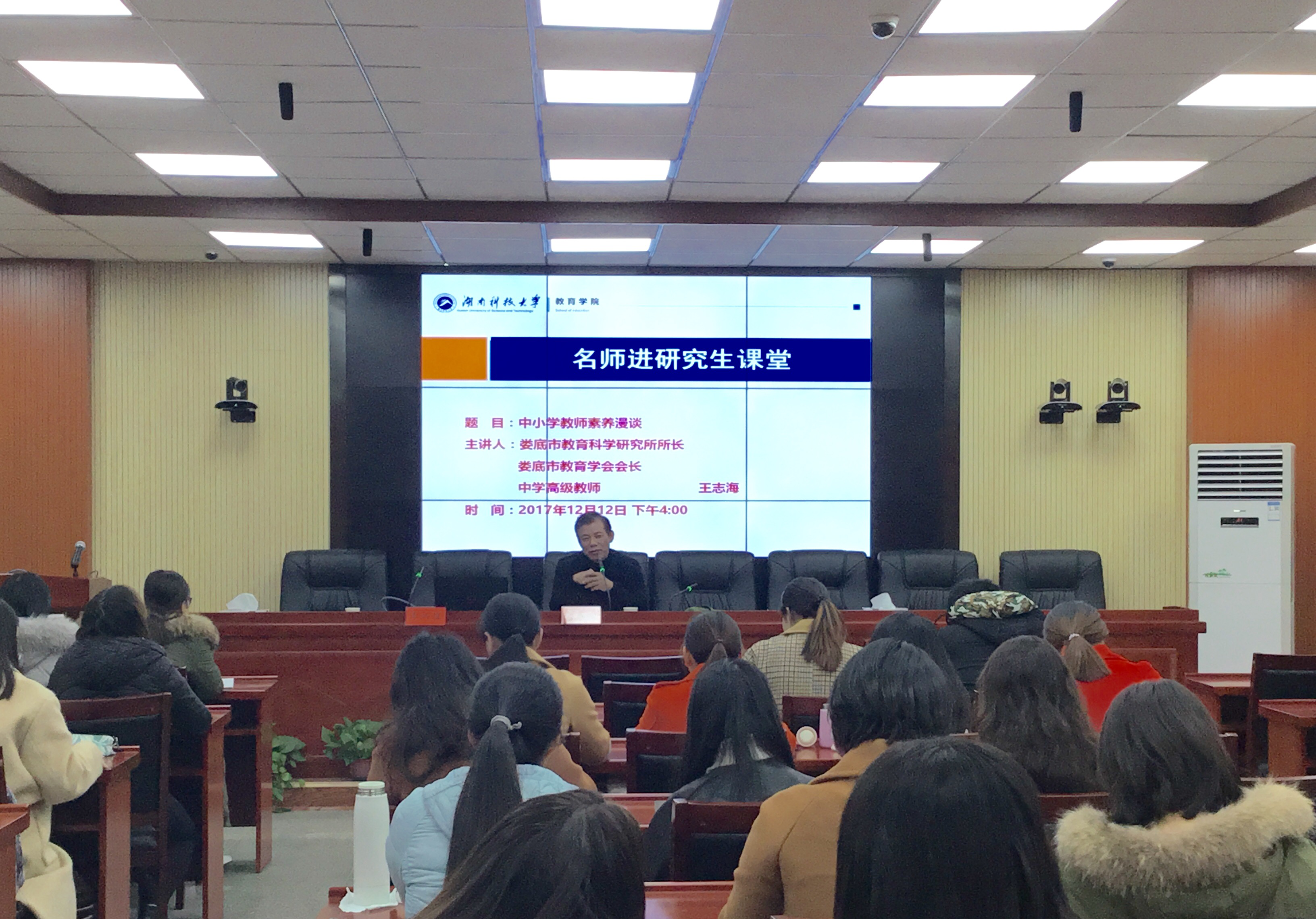 2017年12月12日下午,娄底市教育学会会长、中学高级教师、娄底市教育科学研究所王志海所长莅临我校,在八教308教室开展题为“中小学教师素养漫谈”讲座,2017级全体教育硕士专业研究生和必赢76net线路官网部分本科生参加了本次讲座,讲座由必赢76net线路官网党委书记李炳煌教授主持。