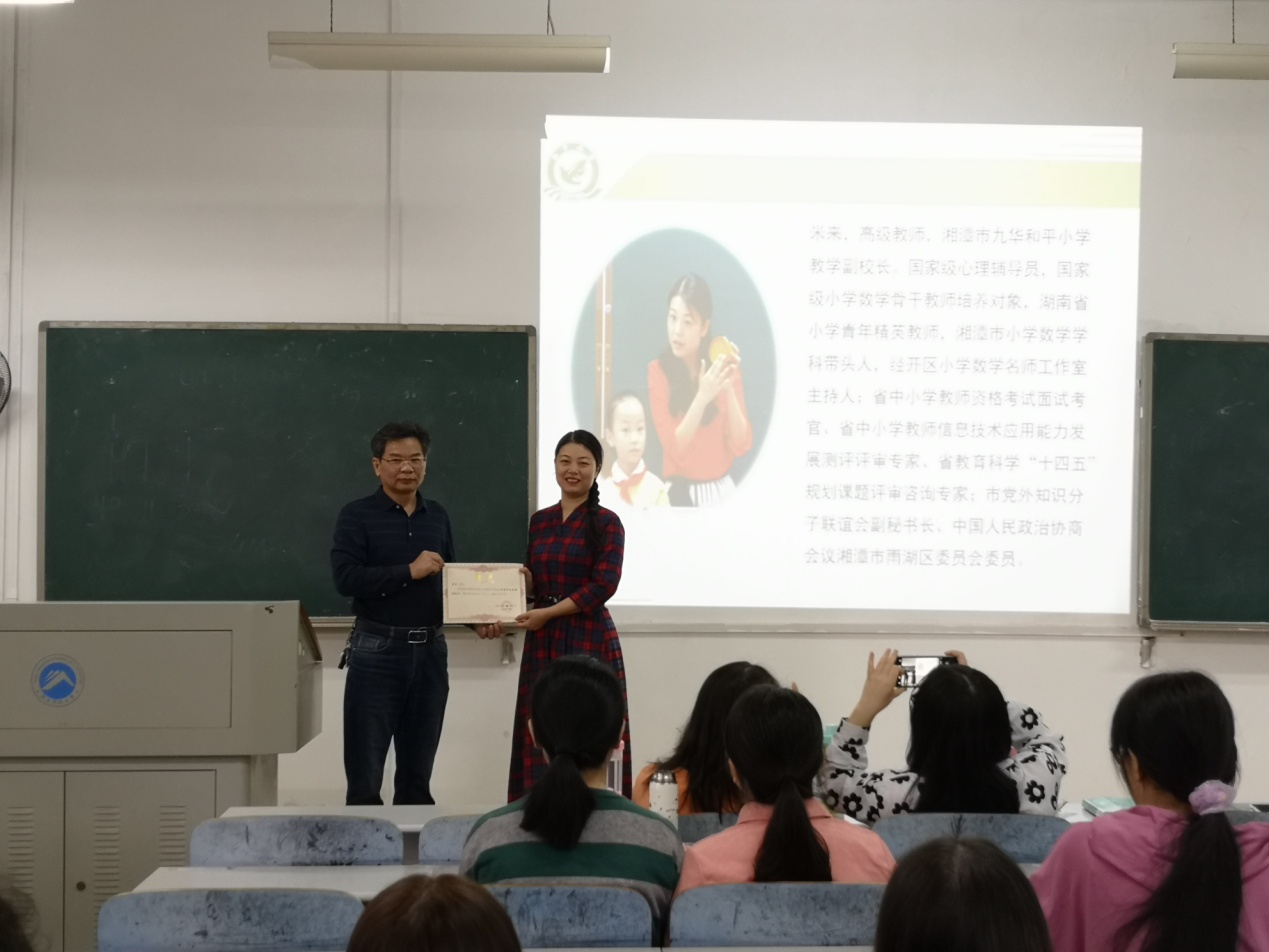 2020年9月21日上午,湘潭市九华和平小学教学副校长,国家级心理辅导员,国家级小学数学骨干教师培养对象,湖南省小学青年精英教师,湘潭市小学数学学科带头人,经开区小学数学名师工作室主持人米来老师应邀参加必赢官网“躬行讲堂”,主讲17级小学教育专业课程:《小学教学案例分析》,讲堂由必赢官网党委书记李炳煌教授主持。