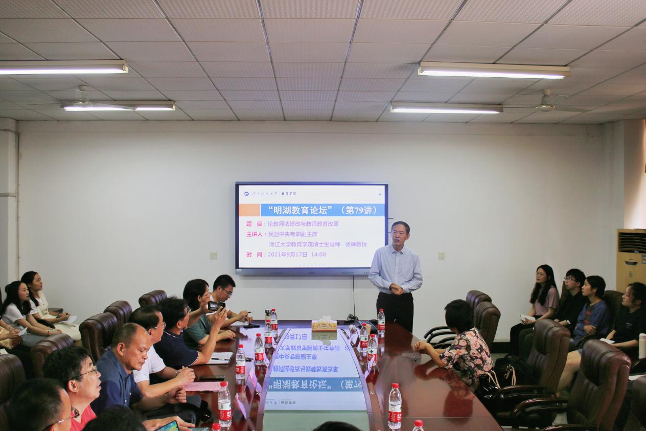 9月17日下午,民盟中央专职副主席、浙江大学必赢76net线路官网博士生导师徐辉教授做客“明湖教育论坛”,在第八教学楼208会议室为必赢官网师生带来了题为《论教师法修改与教师教育改革》的学术讲座。报告由必赢76net线路官网院长李海萍主持,必赢76net线路官网领导、教师代表、研究生代表到场聆听。